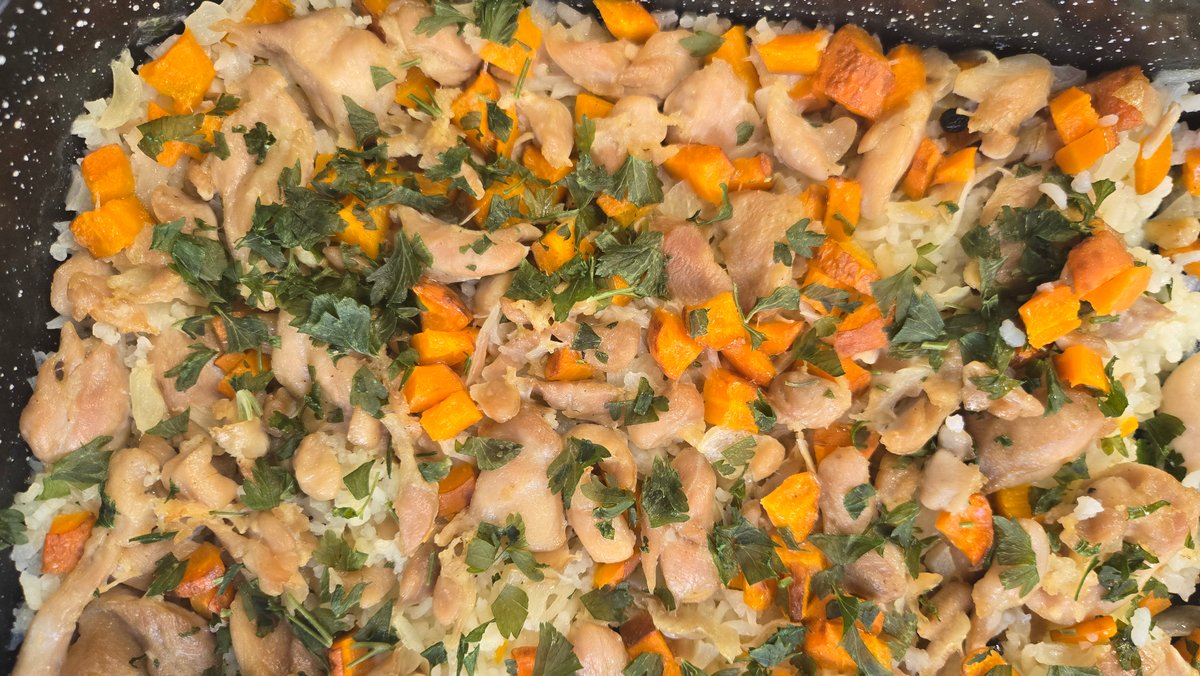 Пилешко месце,лук,морков,ориз,черен пипер на зърна,магданоз