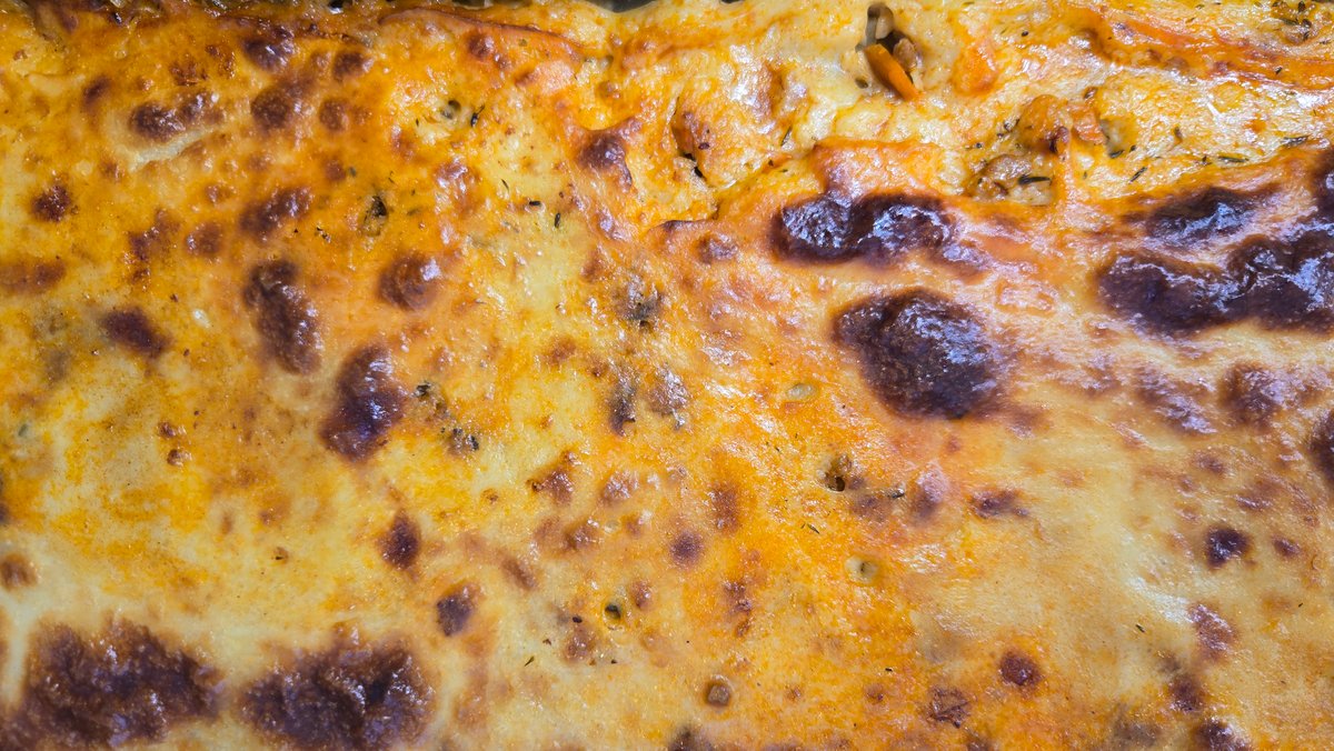 Свинса кайма,картофи,лук,моркови,червен пипер,заливка-яйца,прясно мляко,брашно