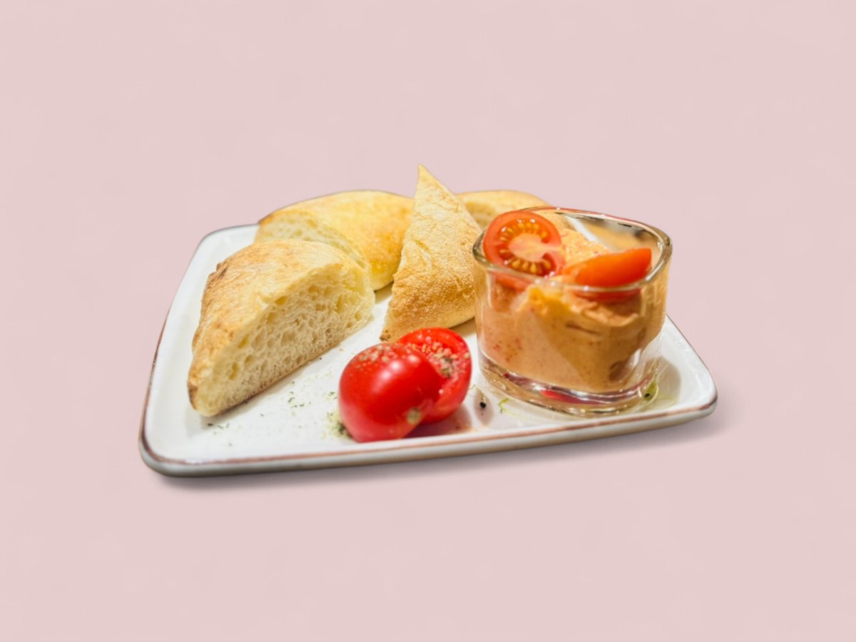 Разядка с мус от печени чушки, моцарела и чери домати
