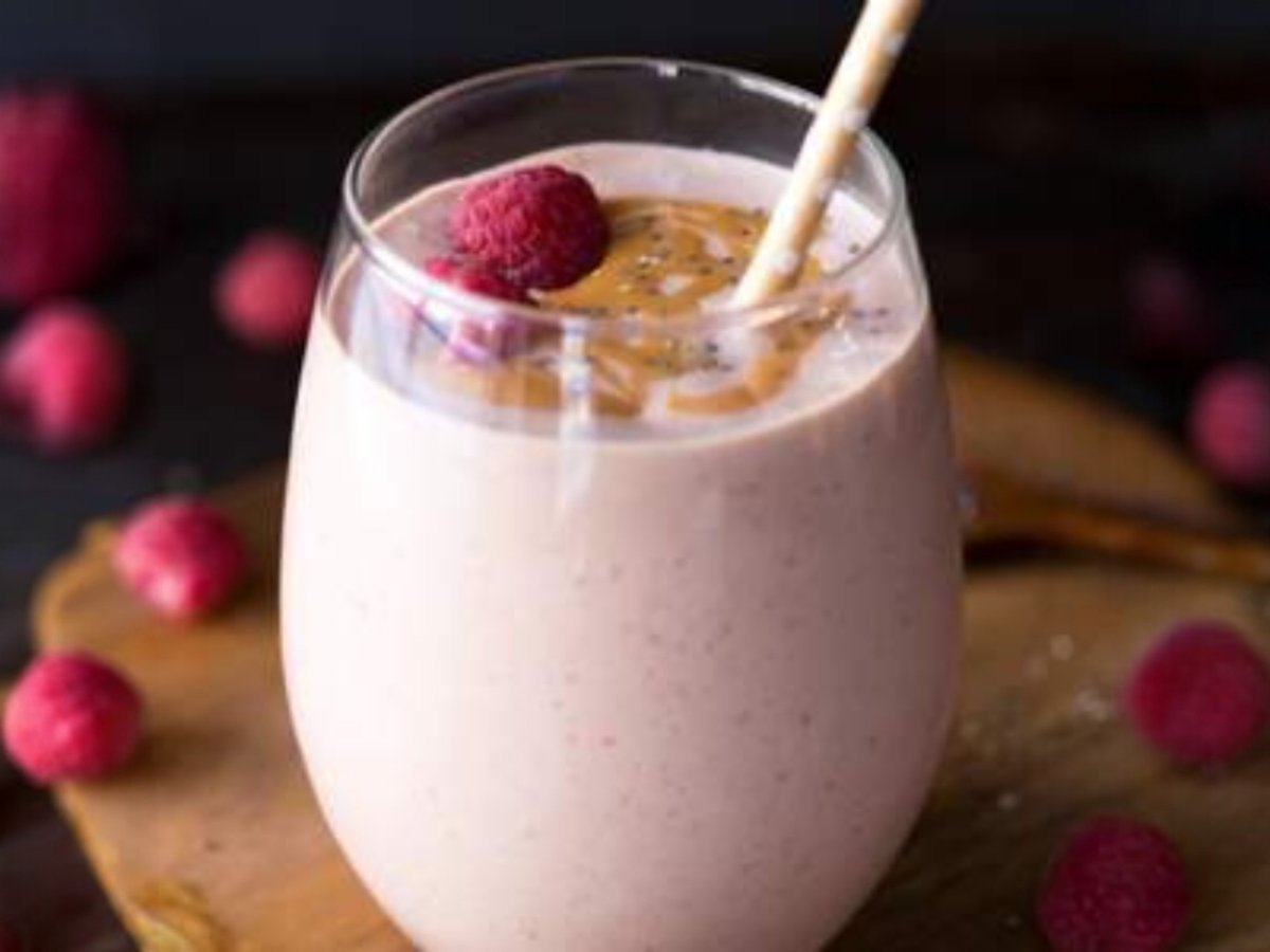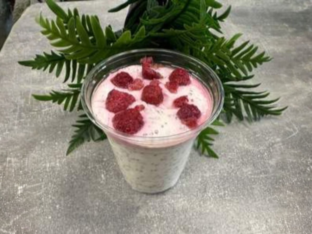 цедено мляко , суроватъчен протеин с вкус "бял шоколад и малини", чиа, малини