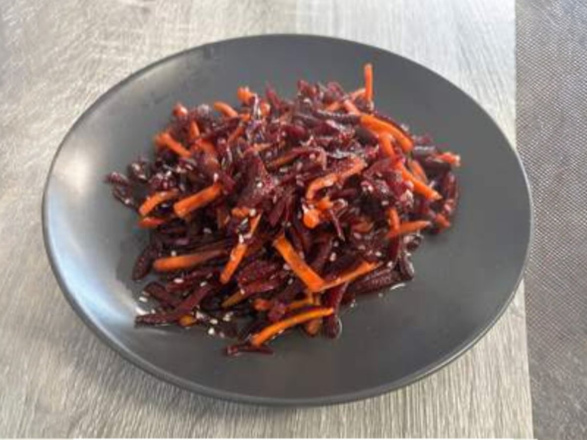 прясно настъргано цвекло с моркови, овкусено със сладък соев сос