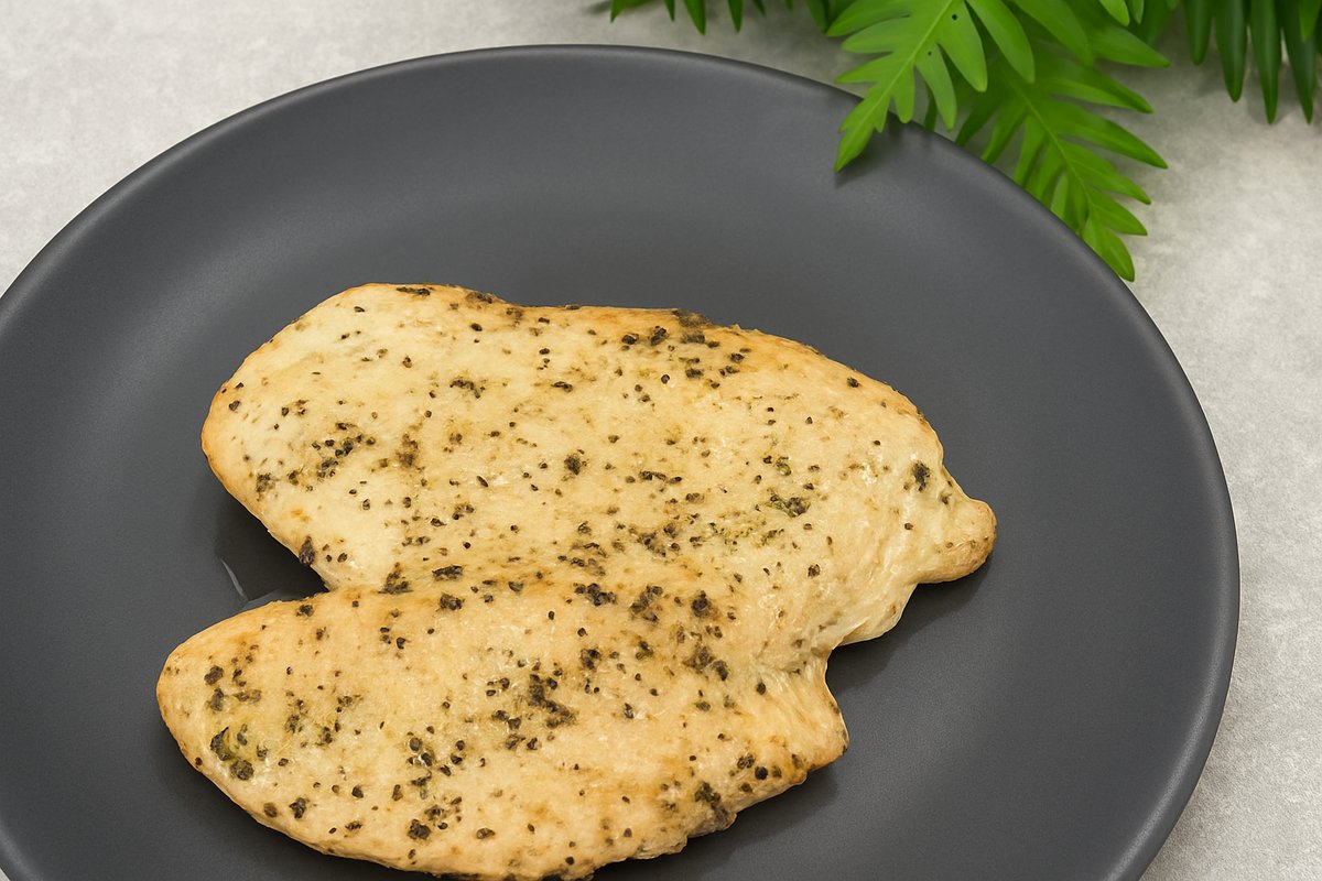 Пилешки гърди подправени с натурални подправки,печено на конвектомат на ниска температура. Сурово състояние: 200 гр