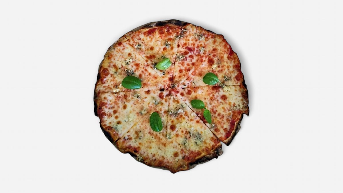 3 дни втасвало тесто (тънко и хрупкаво), доматено пюре с подправки, моцарела, босилек, синьо сирене