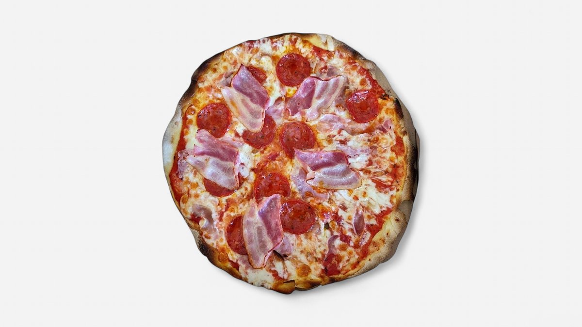 3 дни втасвало тесто (тънко и хрупкаво), доматено пюре с подправки, моцарела, Пеперони, бекон и шунка