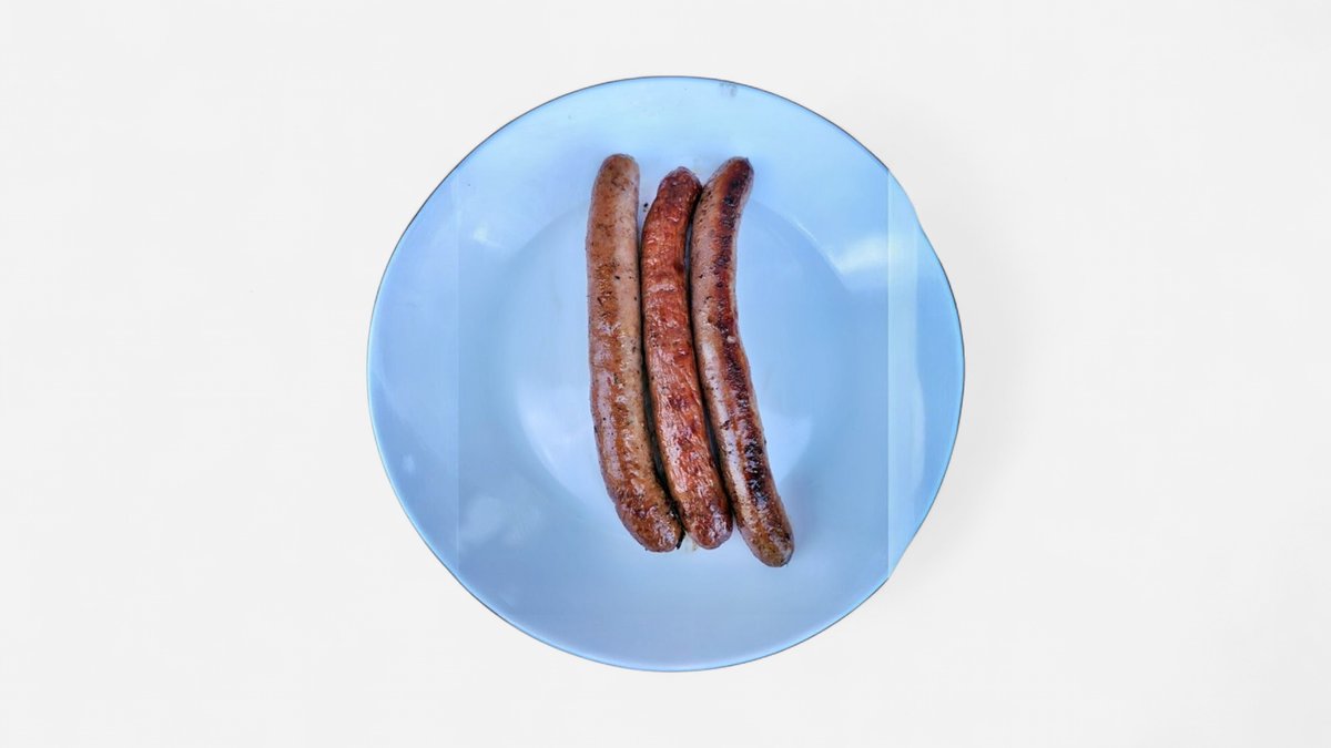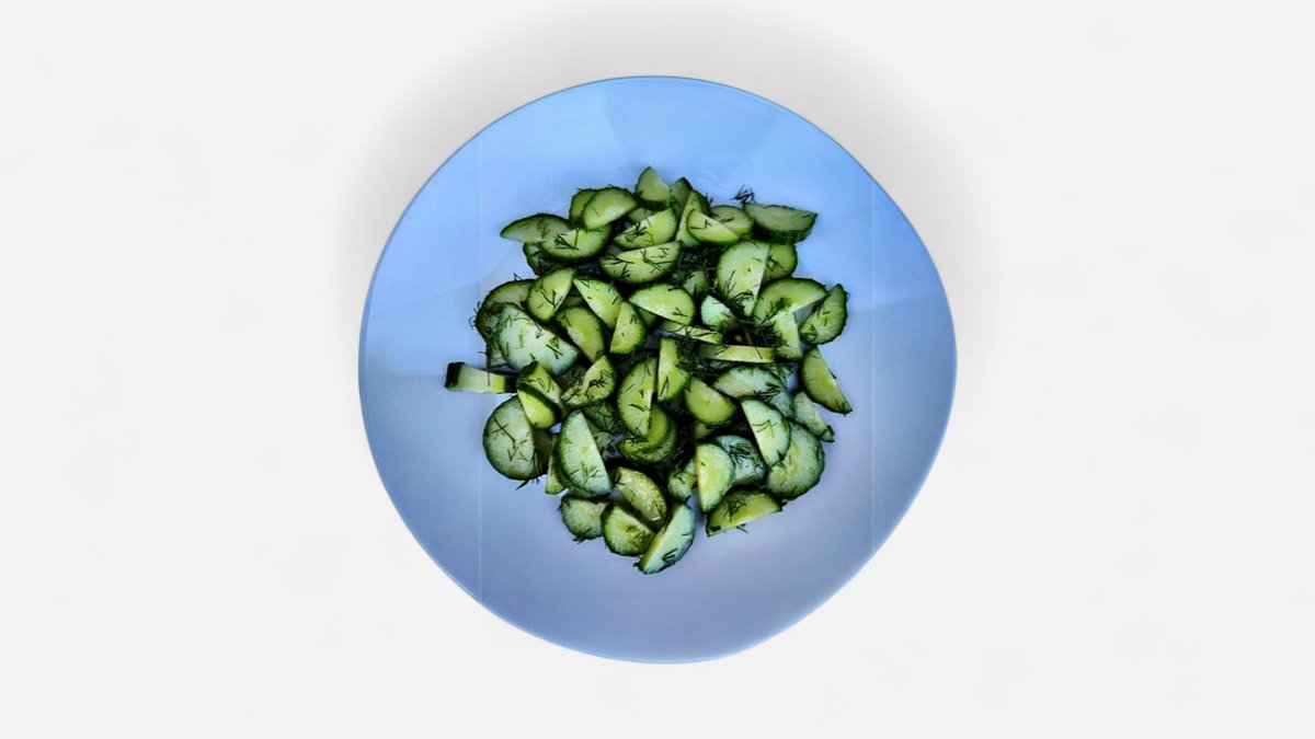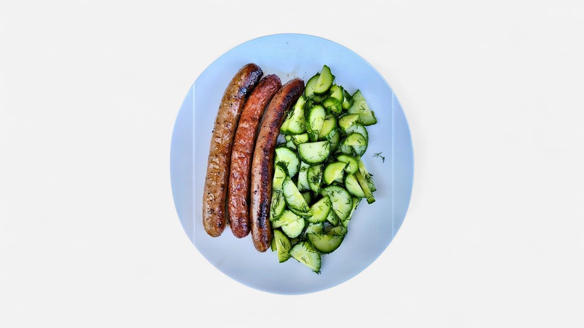 240гр общо конски наденички със сушен домат и подправки. 250гр салата краставици с копър, зехтин, оцет, сол.