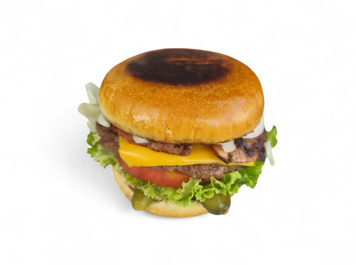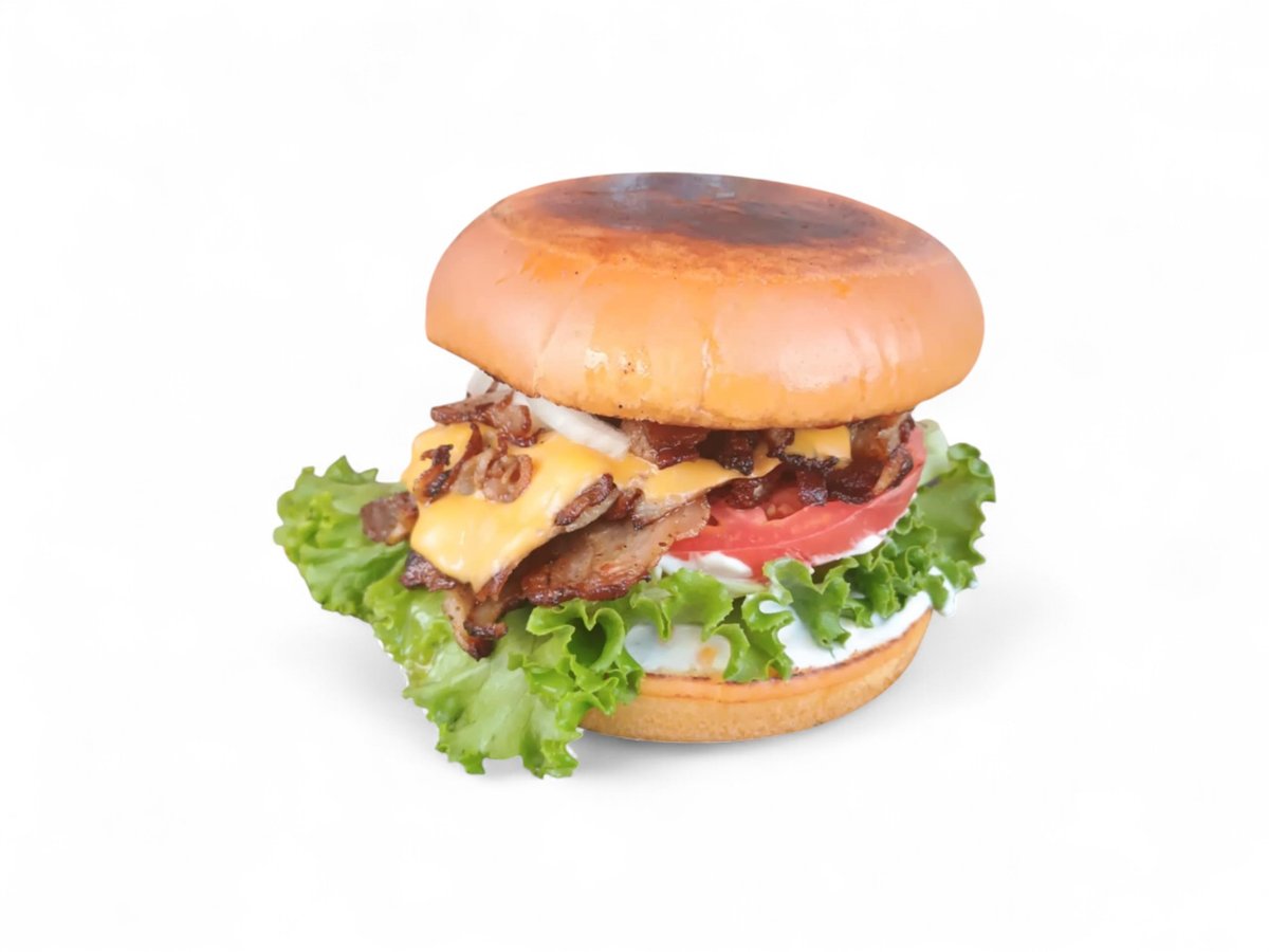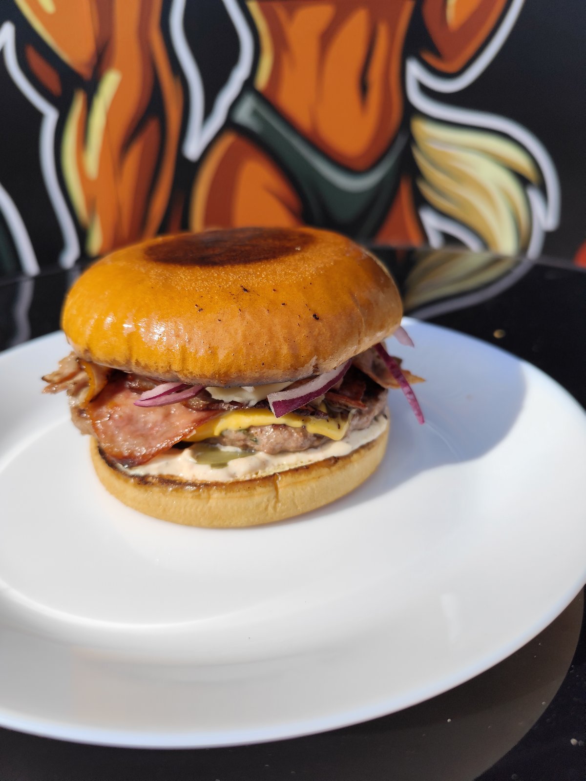 Бриош питка, месо по избор, бекон, бекон, бекон и пак бекон, кисели краставички, чедър, гауда, червен лук, диетичен бургер сос (5% мазнини, 0% захар), барбекю сос.