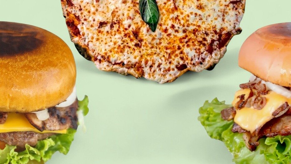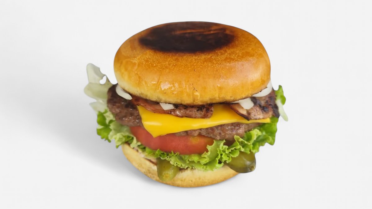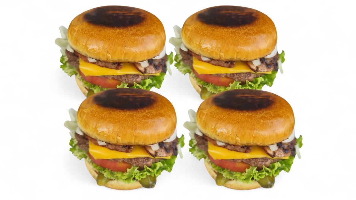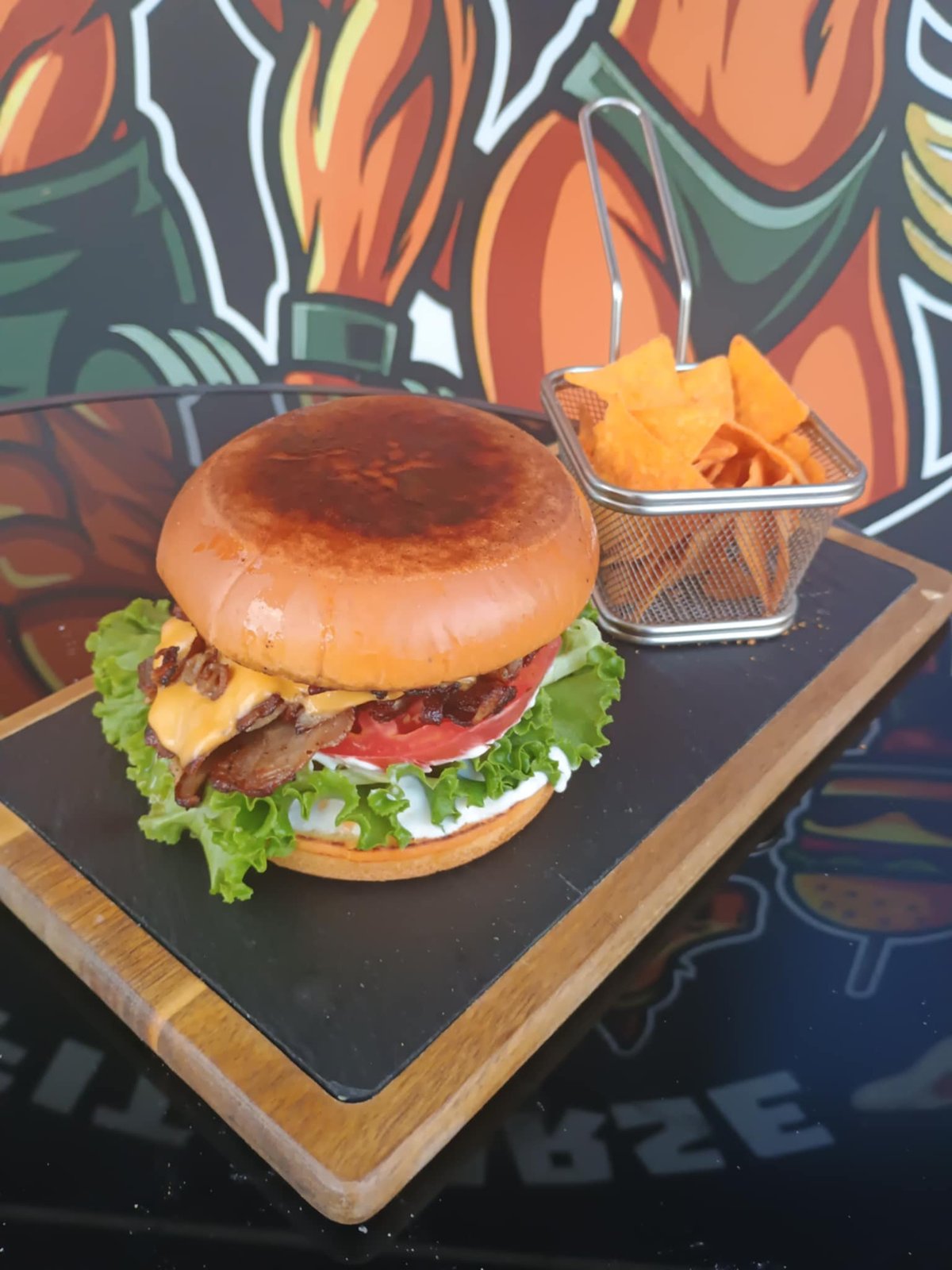 Бриош питка, месо по избор, бекон, бекон, бекон и пак бекон, кисели краставички, чедър, гауда, червен лук, диетичен бургер сос (5% мазнини, 0% захар), барбекю сос.