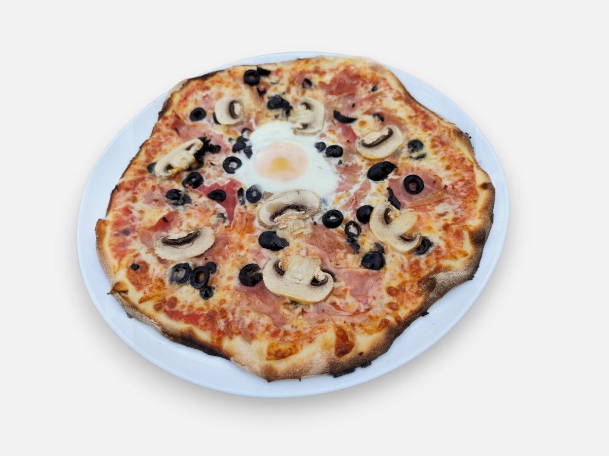 3 дни втасвало тесто (тънко и хрупкаво), доматено пюре с подправки, моцарела, шунка, гъби, маслини, яйце