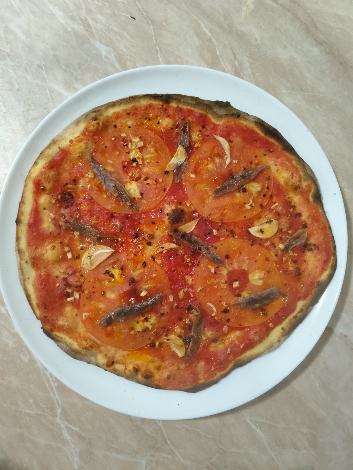 3 дни втасвало тесто (тънко и хрупкаво), доматено пюре с подправки, пресни домати, аншоа, чесън, лют пипер, зехтин