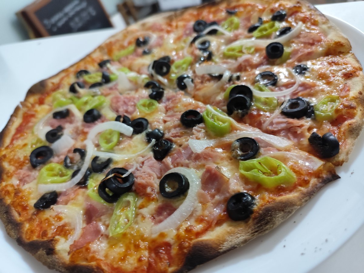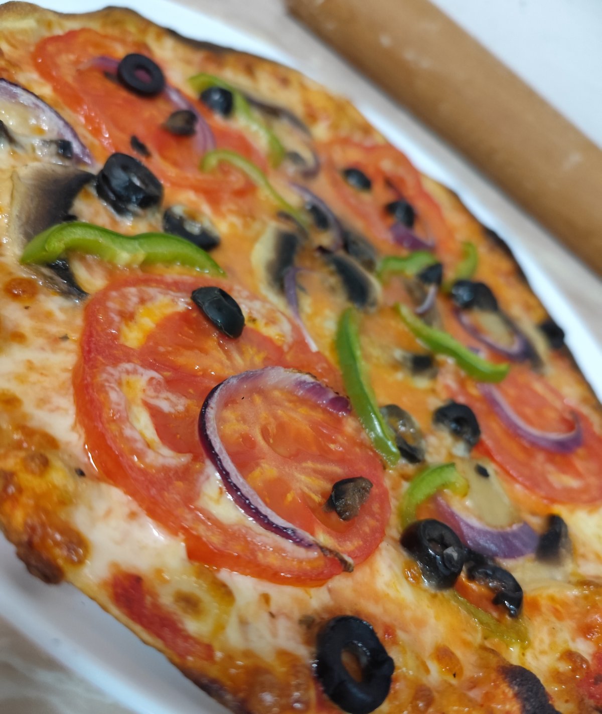 3 дни втасвало тесто (тънко и хрупкаво), доматено пюре с подправки, домати, гъби, чушки, лук, маслини, чесън.