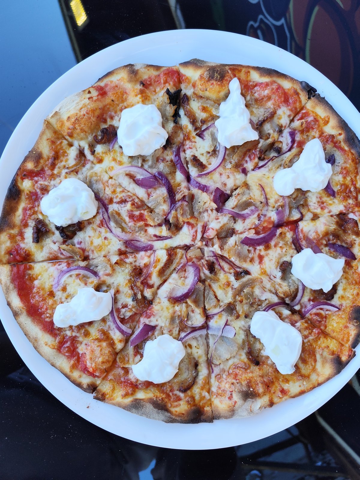 3 дни втасвало тесто (тънко и хрупкаво), доматено пюре с подправки, моцарела, свинско гиро месо, червен лук, дзадзики
