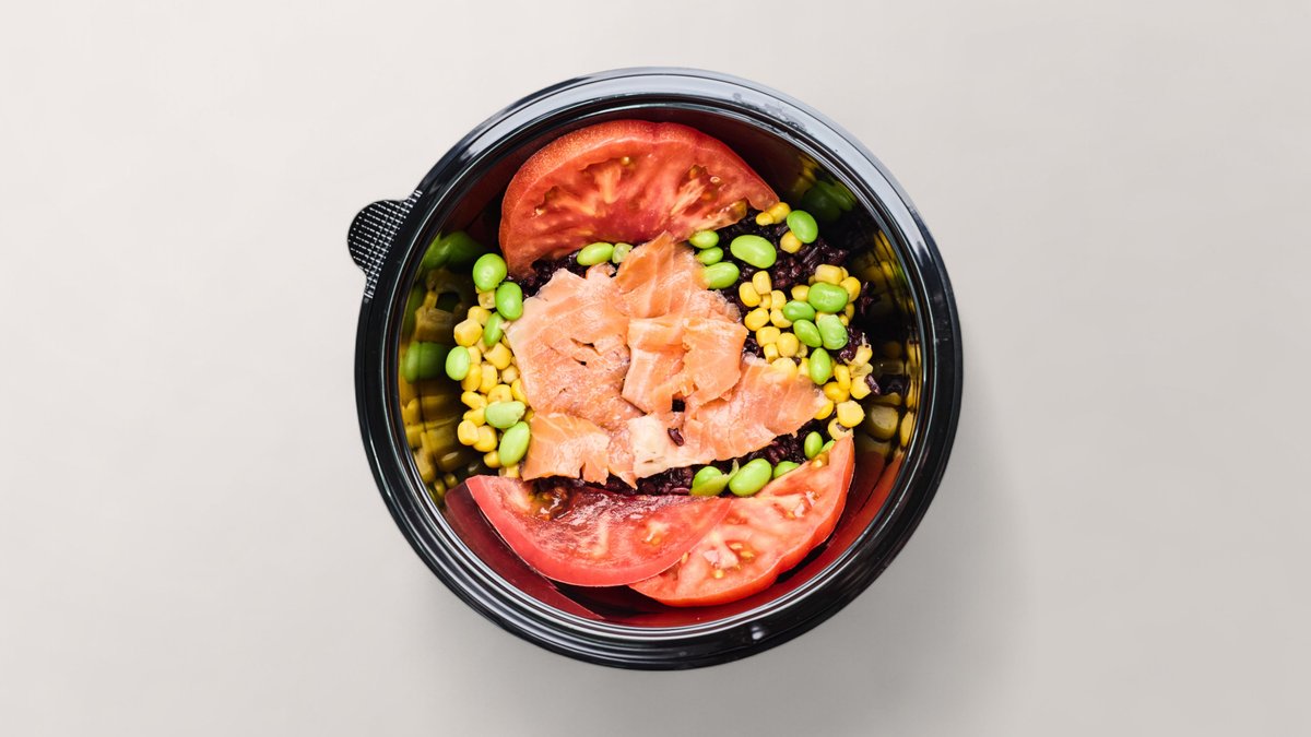 черен ориз, пушена сьомга, едамаме, розов домат и сладка царевица 300 г