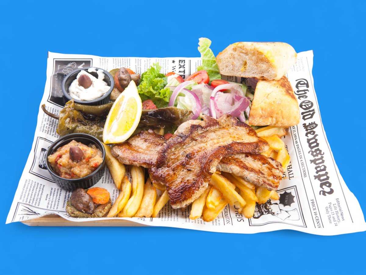 свинско месо-150г, питка-80г, картофи-150г, дзадзики-50г, 1000острова-50г, тиро-50г, домати-30г, краставици-20г, маруля-10г, лук-10г