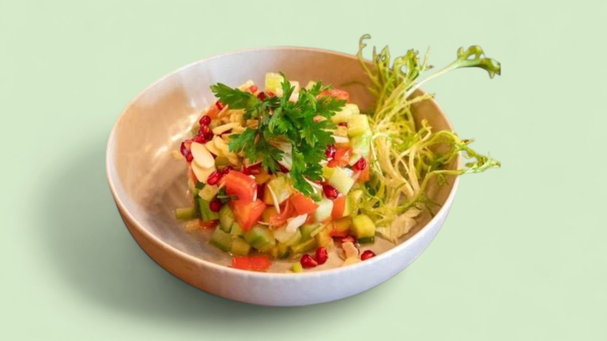 нарязани на ситно домати, краставици и пресен лук, перли от нар, магданоз, филиран бадем, лимонов дресинг и редукция от нар 350г