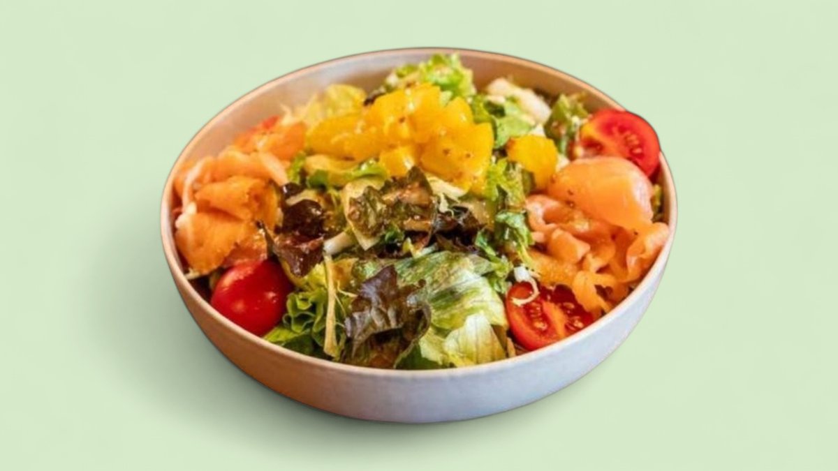 айсберг, зелена салата, чери домати, краставици, пушена сьомга, чътни от ананас, кориандър и дресинг с мед и лимон 300г
