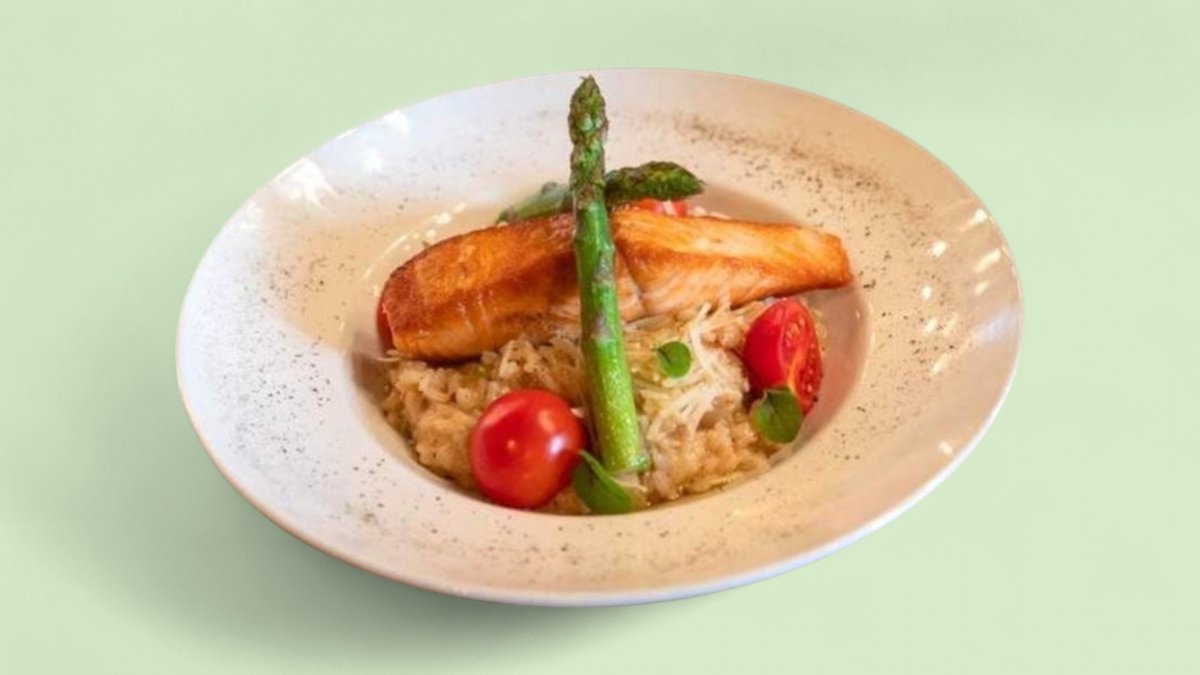 мексиканско ризото със сьомга, чери домати, сушени домати, аспержи и Пармезан 300г