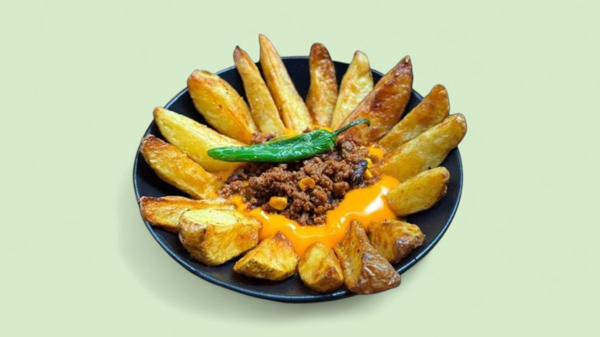 Пържени картофи с чедър сирене и чили кон карне