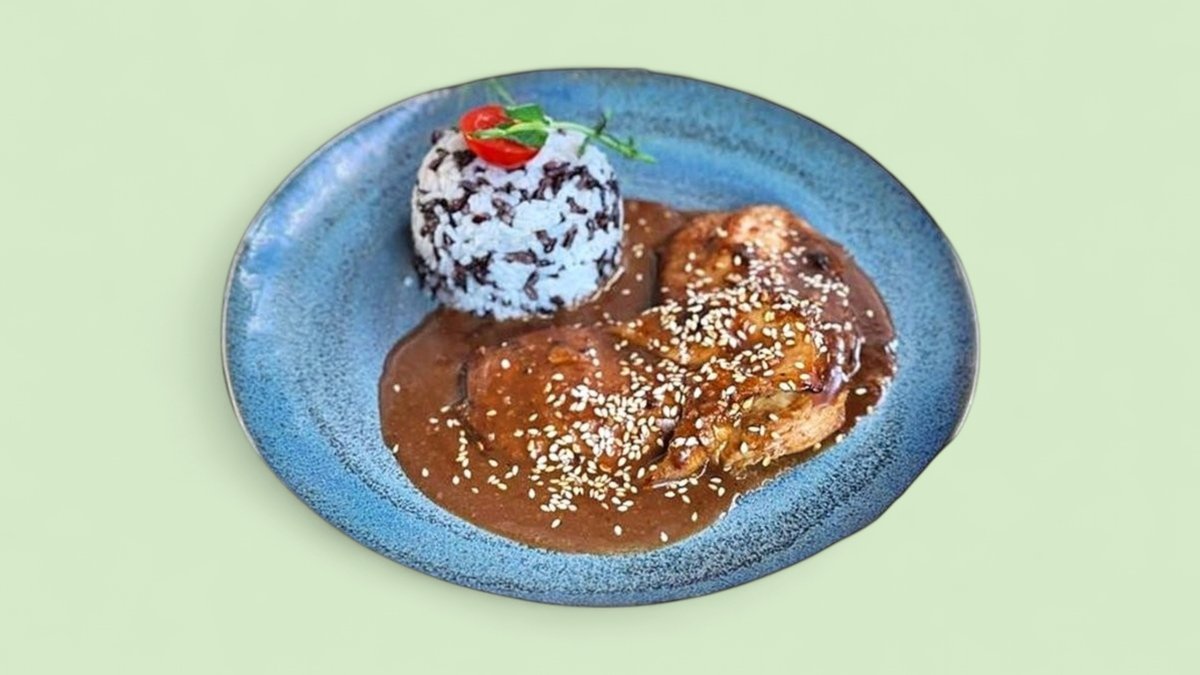 пилешко филе с традиционен перуански сос с шоколад, гарнирано с дуо от жасминов и черен ориз 350г Имайте предвид, че в ястието има какаови зърна, които може да включват следи от (различни) ядки.