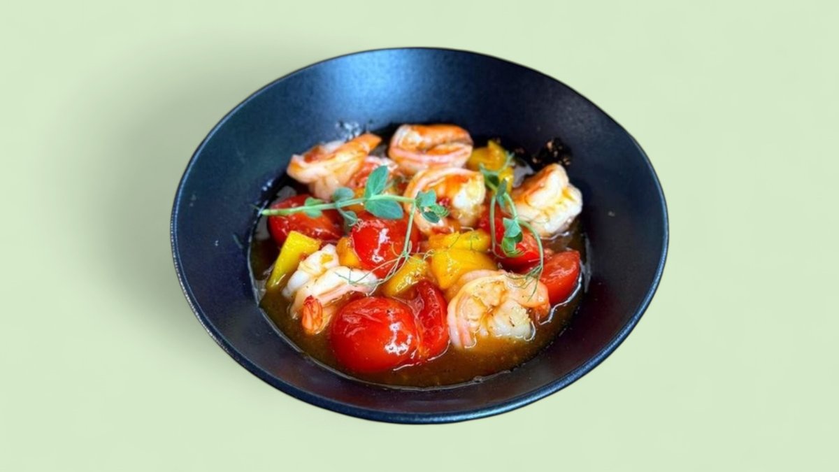 8 броя скариди с чери домати, чътни от ананас, сладко-лют сос и манго сос 300г