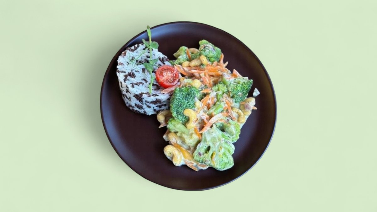 броколи, моркови, бял ориз, червен лук, джинджифил, кашу, кокосово мляко 300г