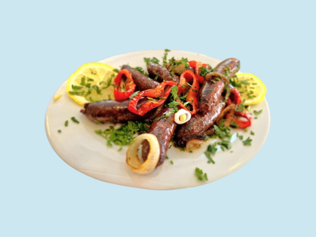 хляб, телешка кайма, пикантни суджук, подправки, чери домати и магданоз (300 г)
