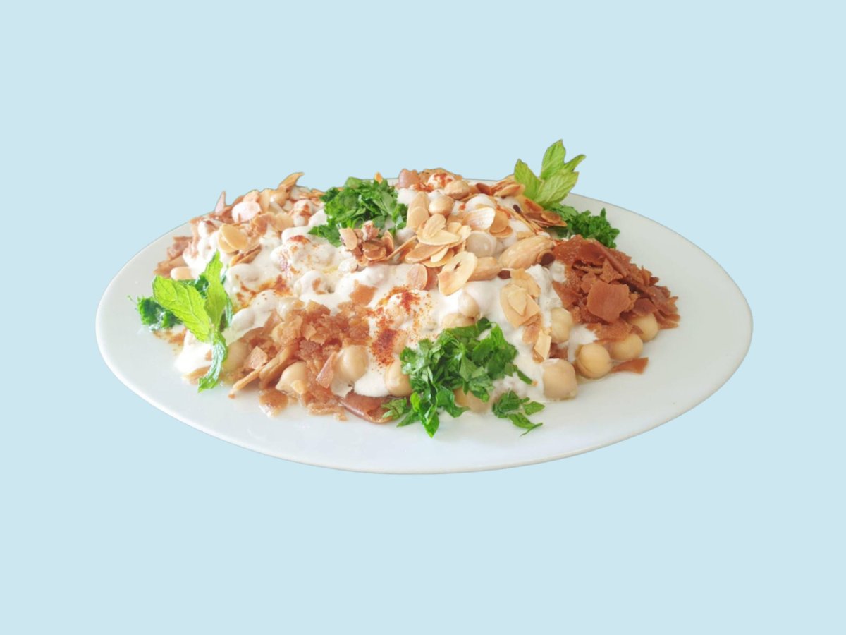нахут, кисело мляко, тахан, пържен арабски хляб, нар, пържени картофи, ядки и магданоз