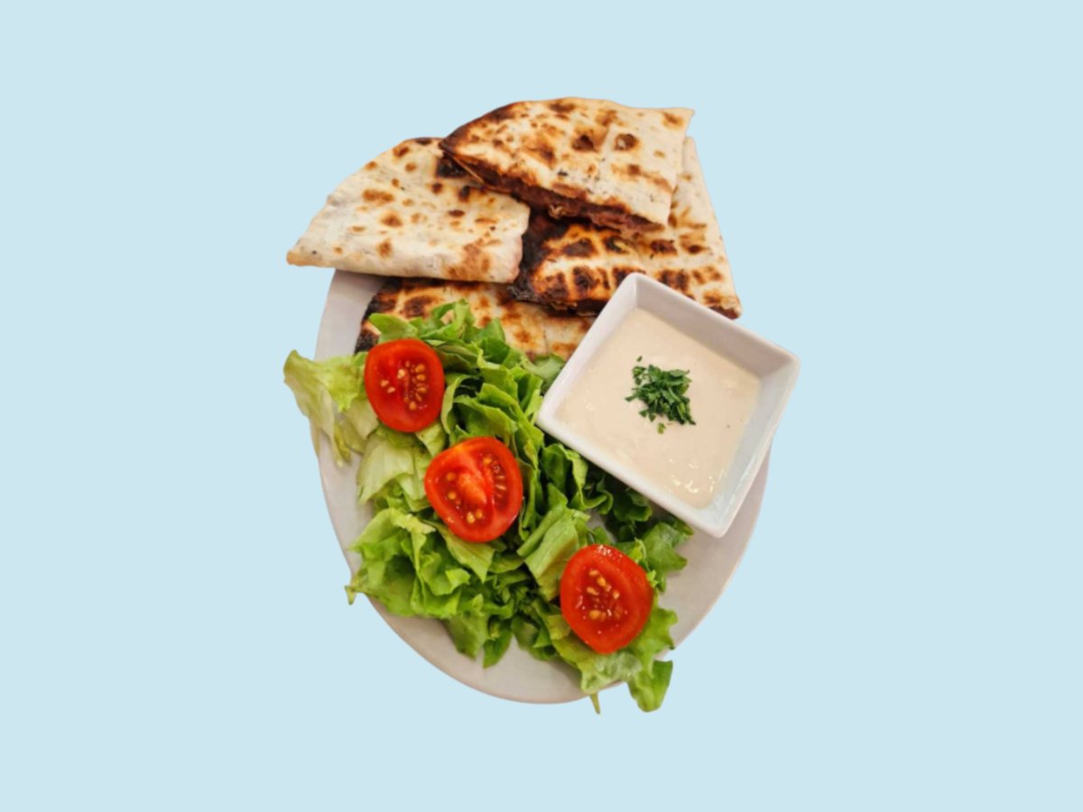 телешка кайма с лук и магданоз в арабска питка, домати и лук на скара, чеснов сос (300 г)