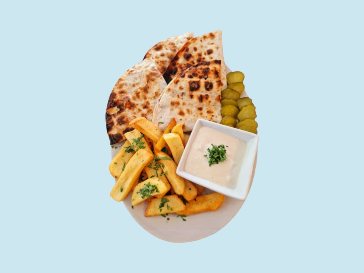 картофи, патладжан, тахан, кисело мляко, пържен арабски хляб, ядки (350 г)
