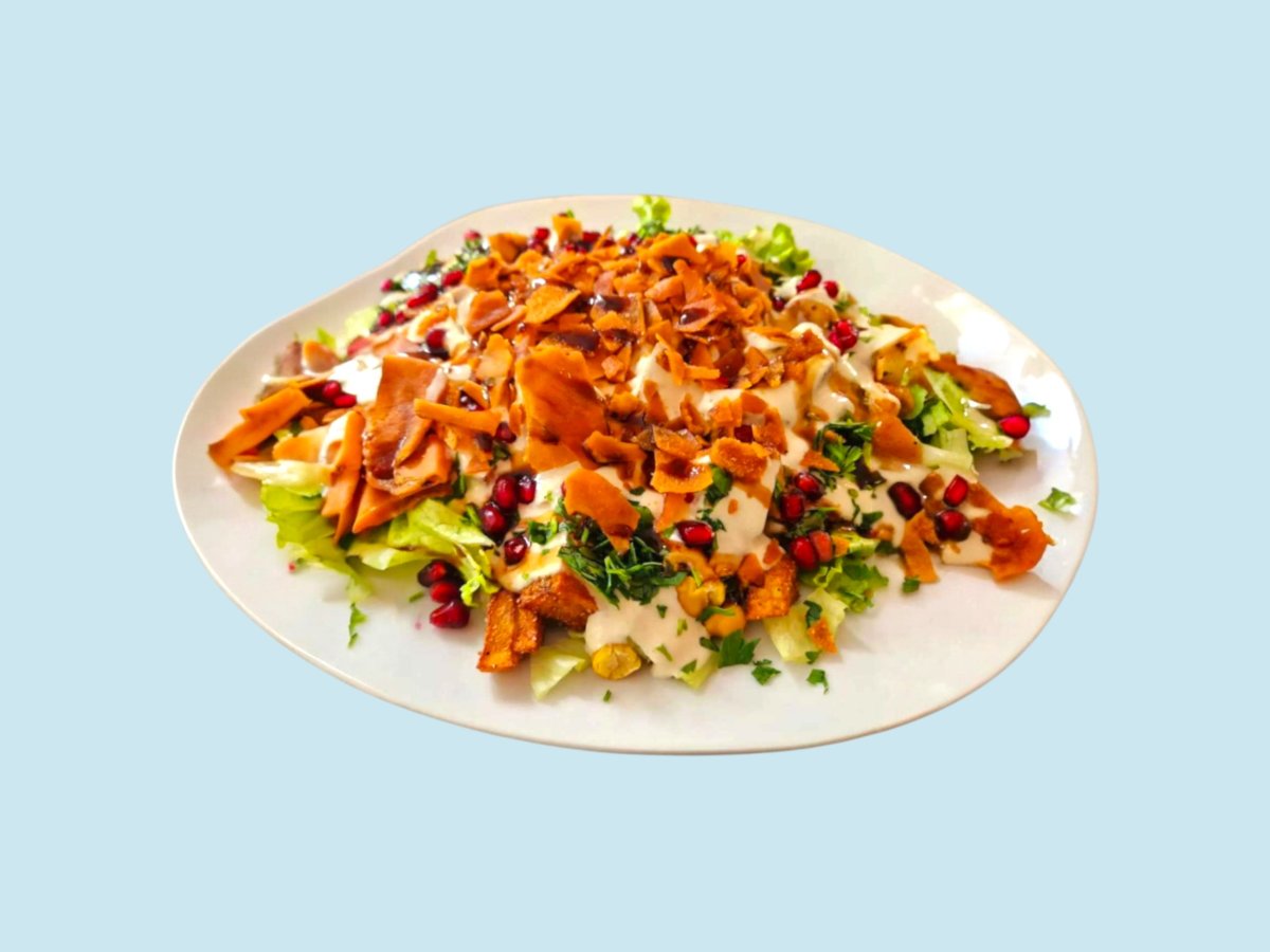 домати, краставици, зелена салата, лук, сок от нар, пържен арабски хляб (350 г)