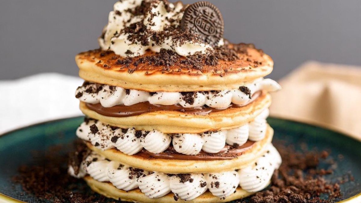 4 броя сладки американски палачинки, обилно поляти с Nutella и покрити с бита сметана и натрошени бисквити Oreo 280г