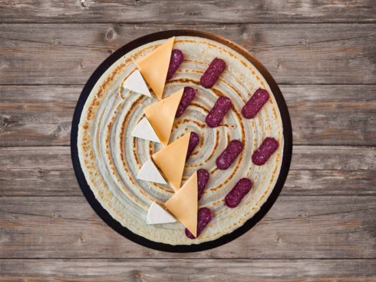 солена палачинка с луканка на слайс, топено сирене и Чедър сирене