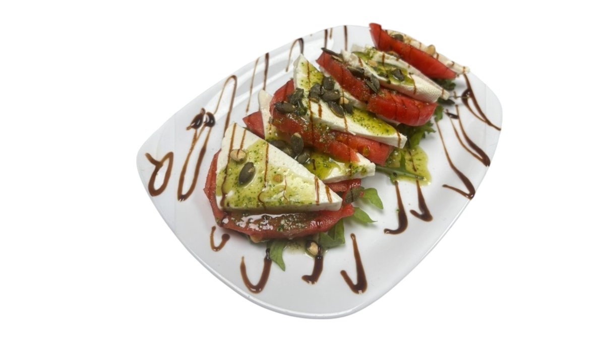 домати с прясно сирене, рукола, песто, тиквени семки 300г