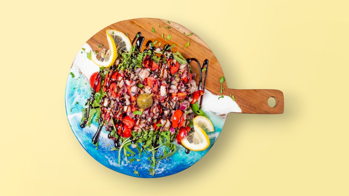 октопод, чери домати, каперси, рукола, червен лук, магданоз, оцет балсамико 350г