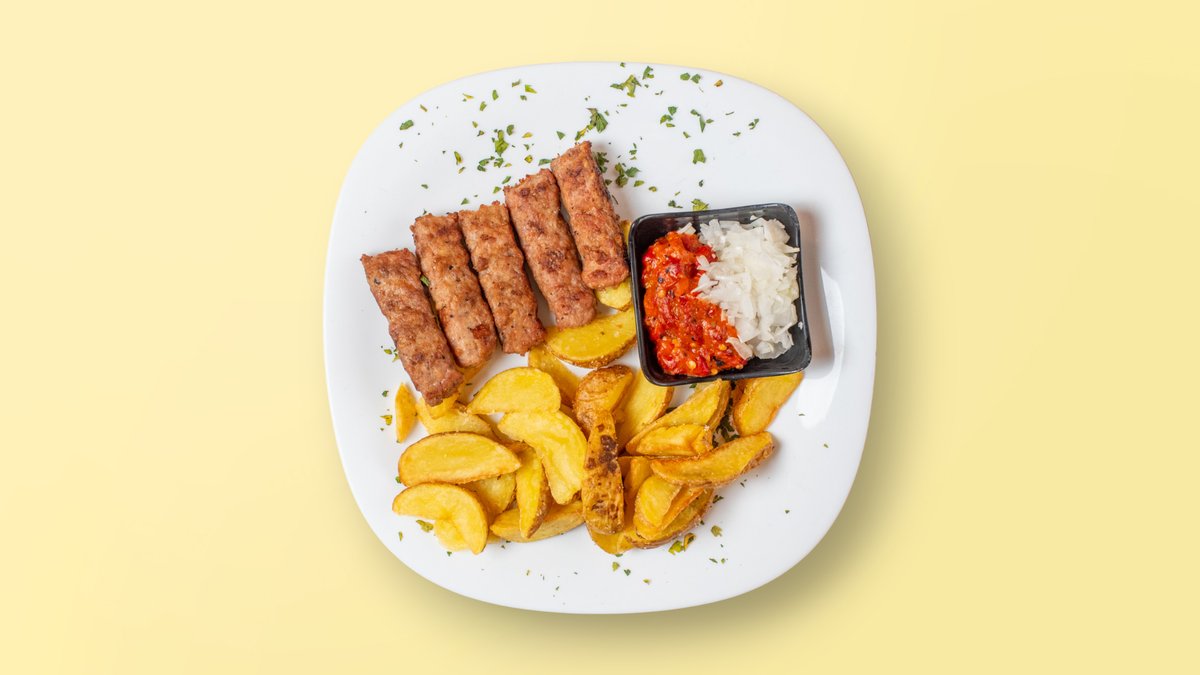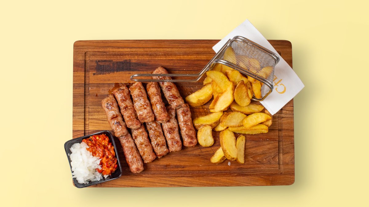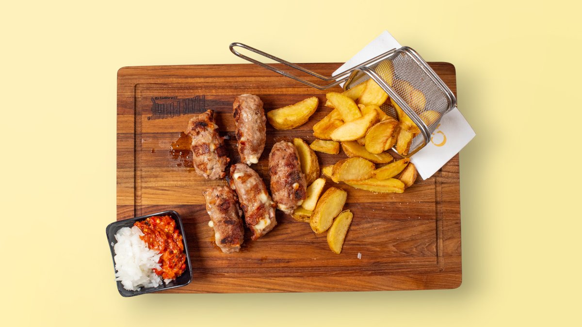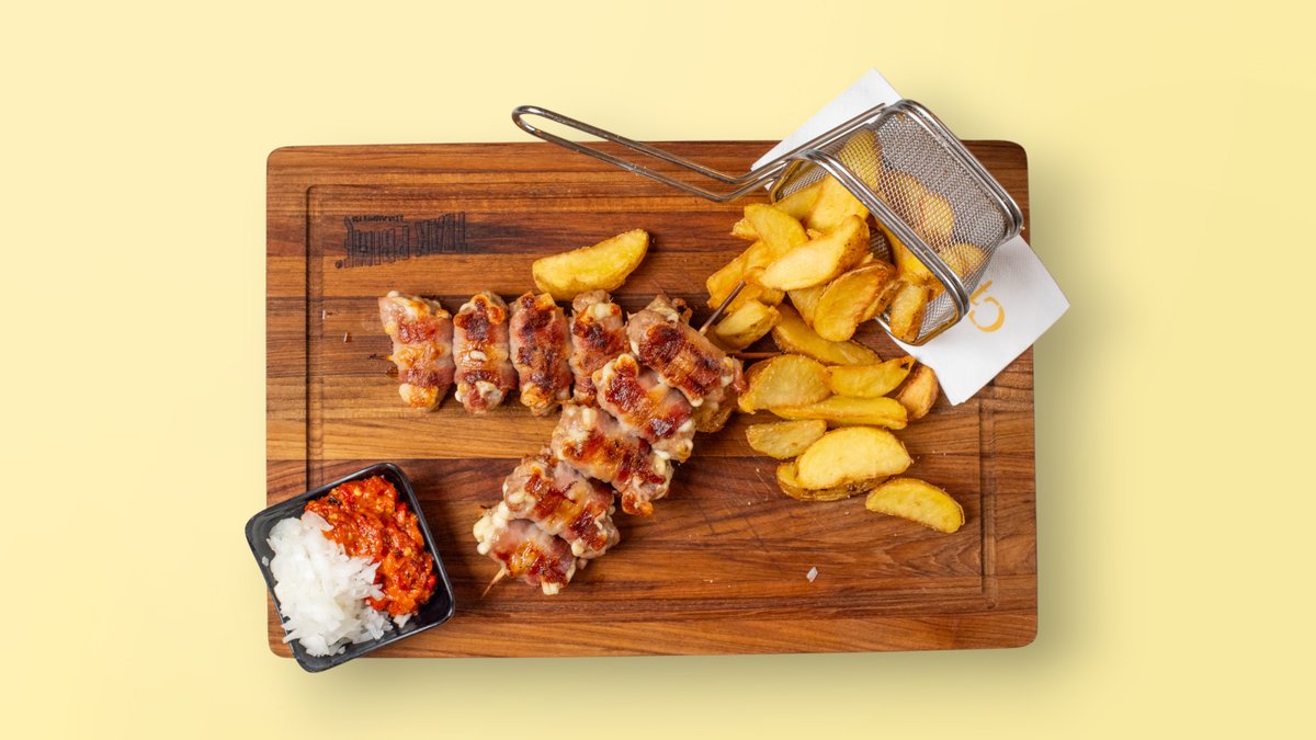 кебапчета, ущипци, руловано пилешко шишче, руловани кебапчета, пушена колбасица + пържени картофи, айвар и лук 1500г