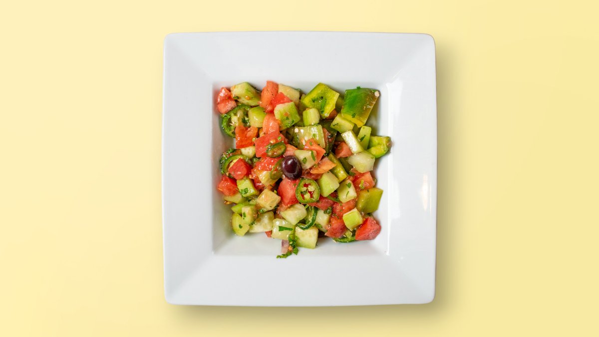 домати, краставици, прясна чушка, лук, люта чушка нарязана на ситно 350г