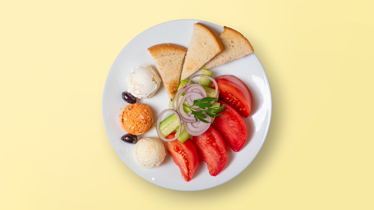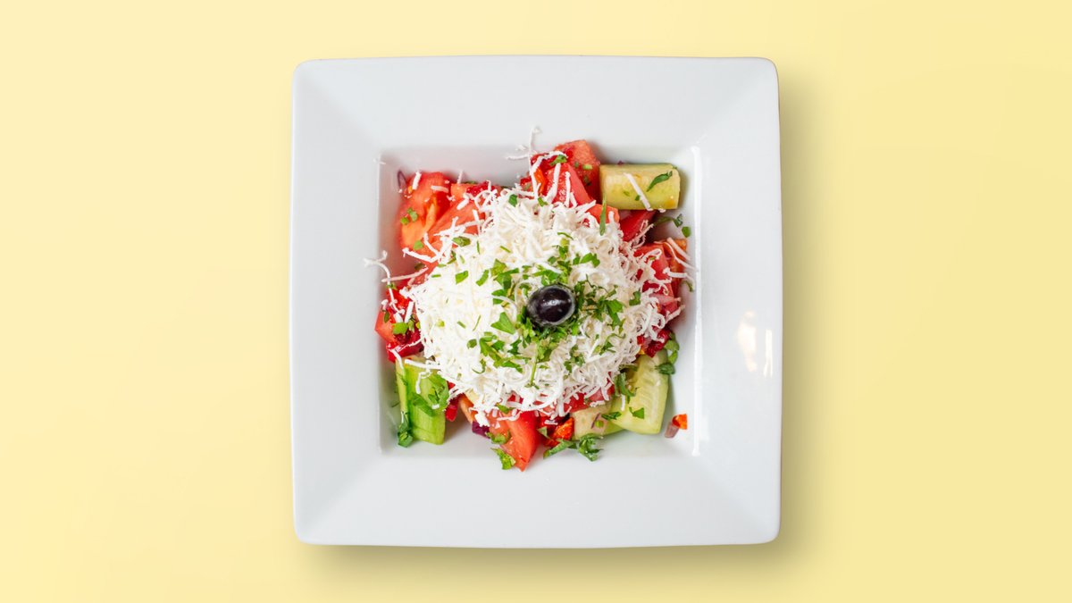 домати, краставици, лук, печени чушки, краве сирене 350г