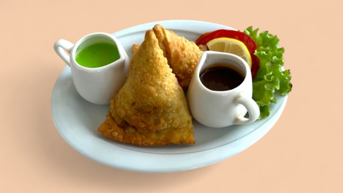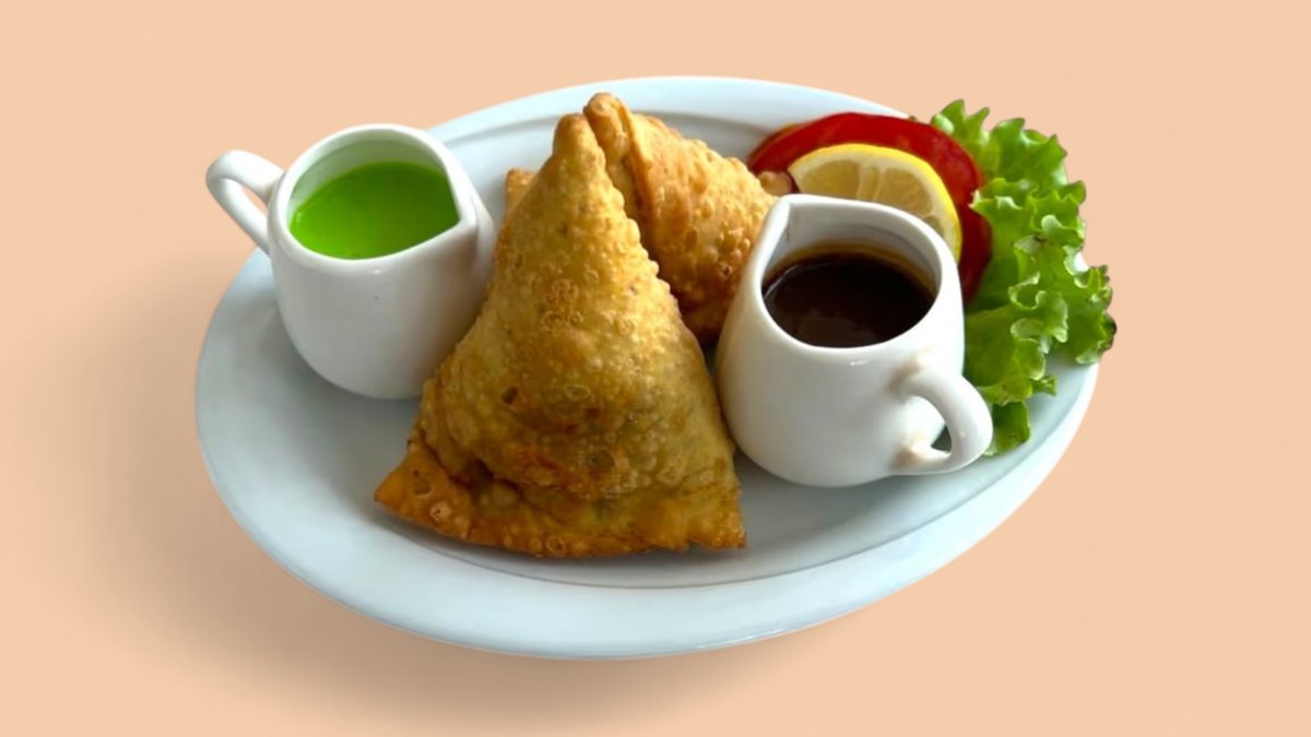 хрупкави триъгълни хапки с плънка от зеленчуци и индийски подправки, сервирани отделно с ментов и имли сос - 250г