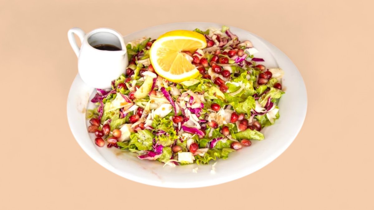 екзотична комбинация от сочен нар, свежа зелена салата, хрупкави краставици, червено зеле, лук и панир (индийско сирене), нежно овкусени с дресинг от нар - 300г