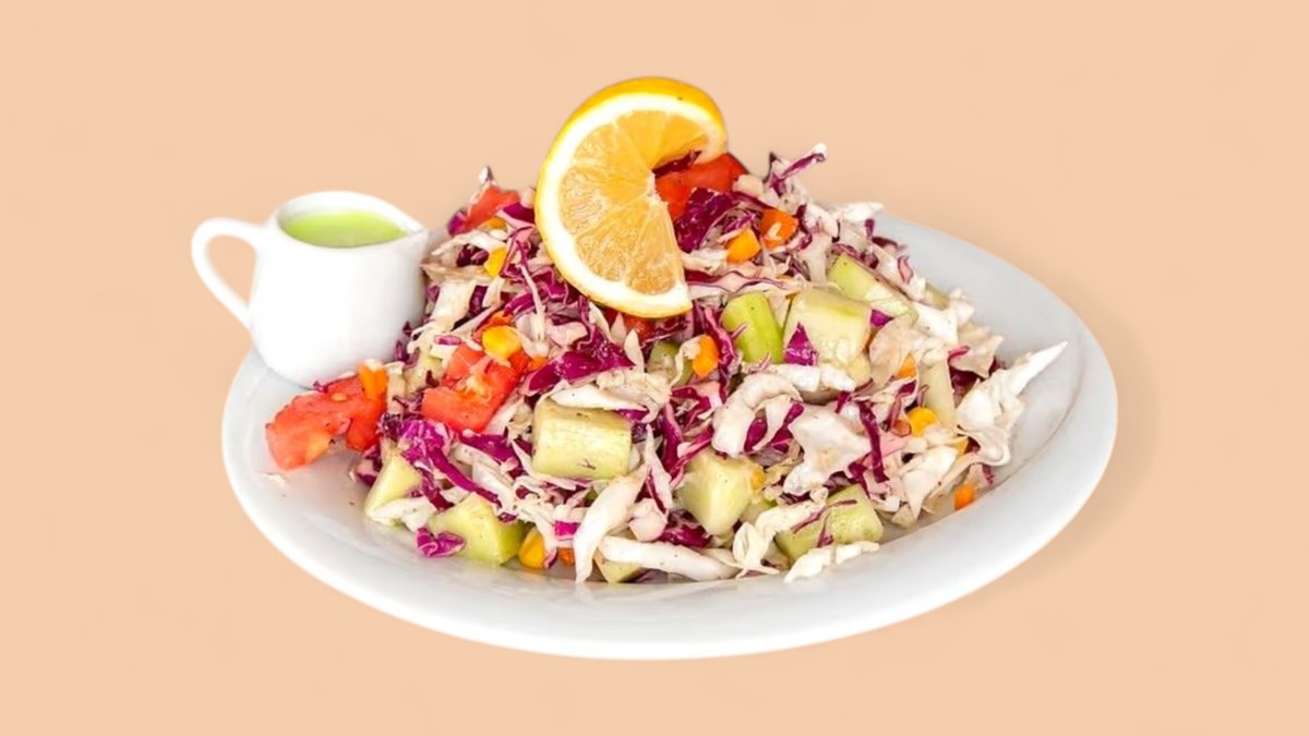 свежа и леко пикантна салата с бяло и червено зеле, нарязани домати, краставици, царевица, моркови, зелена салата, с фин лимонов дресинг и ментов сос (сервиран отделно) - 300г