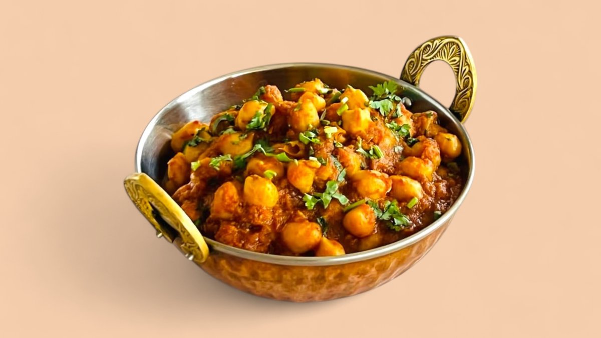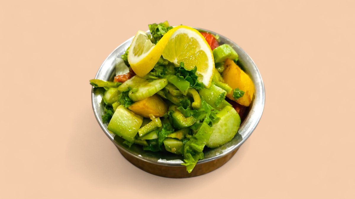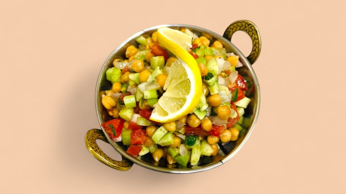 апетитна салата от нахут, домати, лук, люти чушки и мента, овкусена с лимон и чат масала Типична