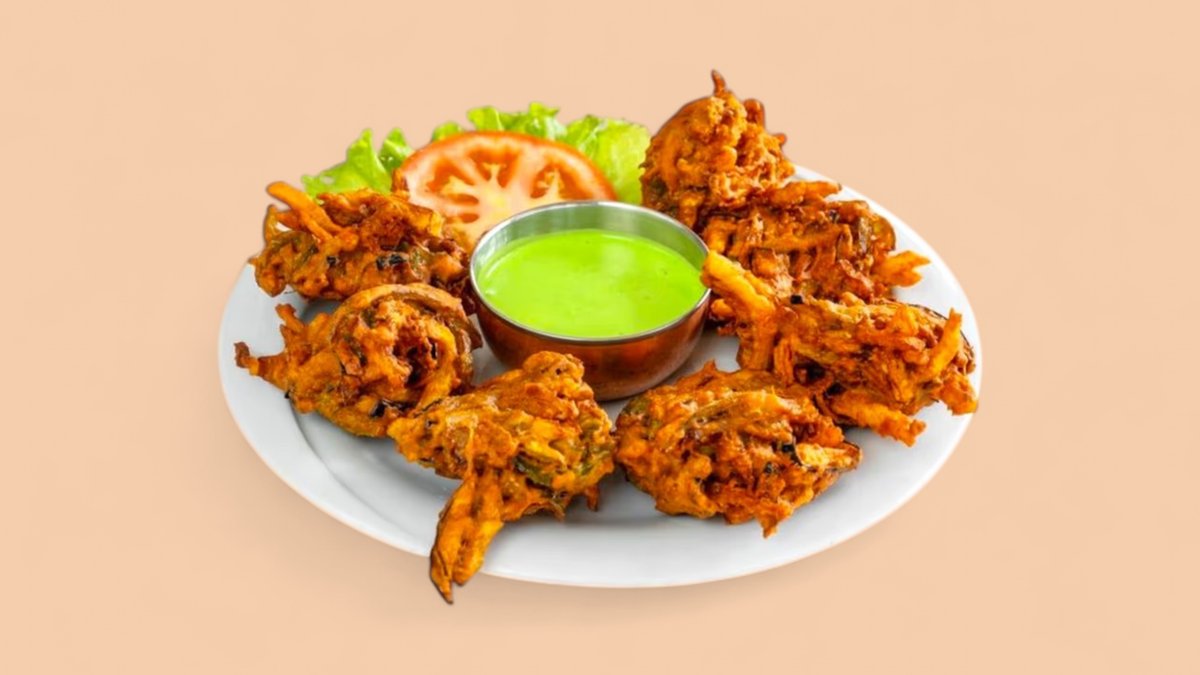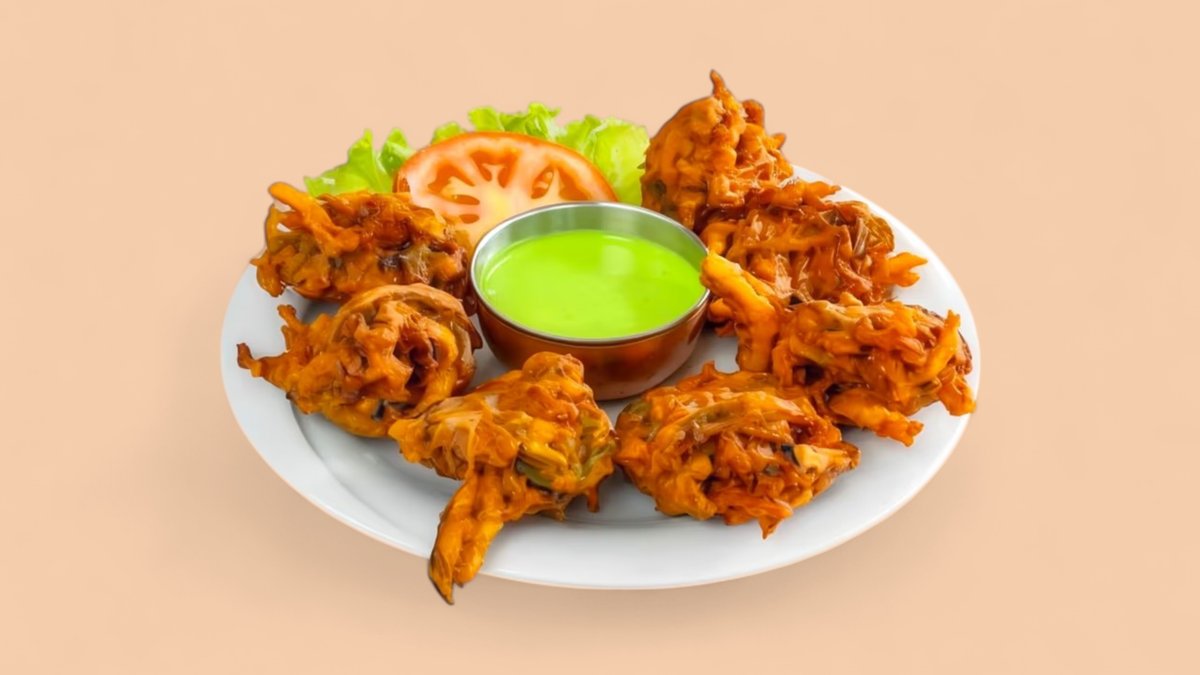 златисто паниран лук в нахутено брашно и ароматни подправки-идеално начало за индийска вечеря, сервира се отделно с ментов сос - 250г