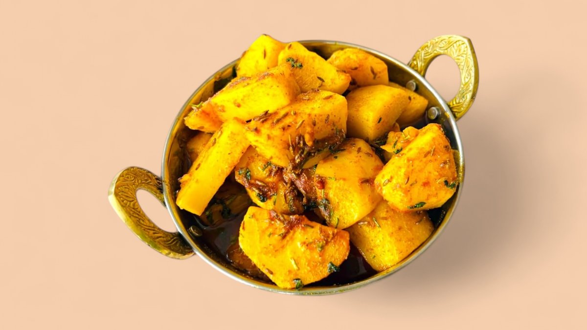 екзотична салата с картофи, краставици и мариновано пилешко филе, изпечено в тандур, овкусена със сладък манго чътни сос - 300г