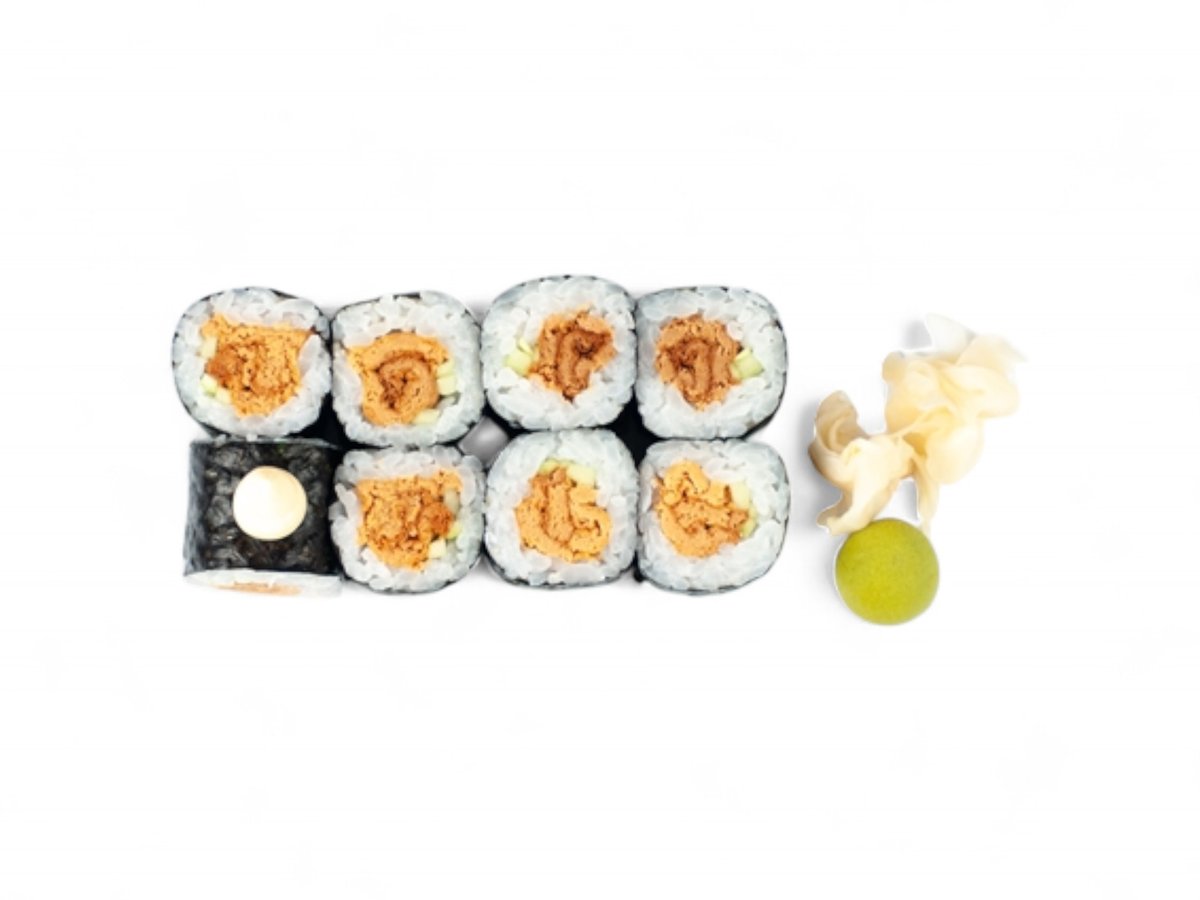 8 броя, ориз, нори, запечен тон, краставица, авокадо, японска майонеза, хайвер от летяща риба, към всяка порция има джинджифил 220г