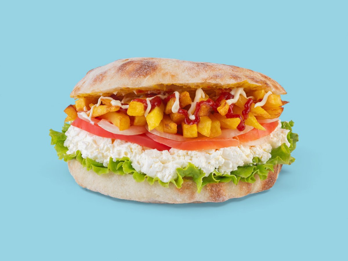 400г - крема сирене от ферма, ръчно хлебче,свежи зеленчуци, домашни картофки, сос