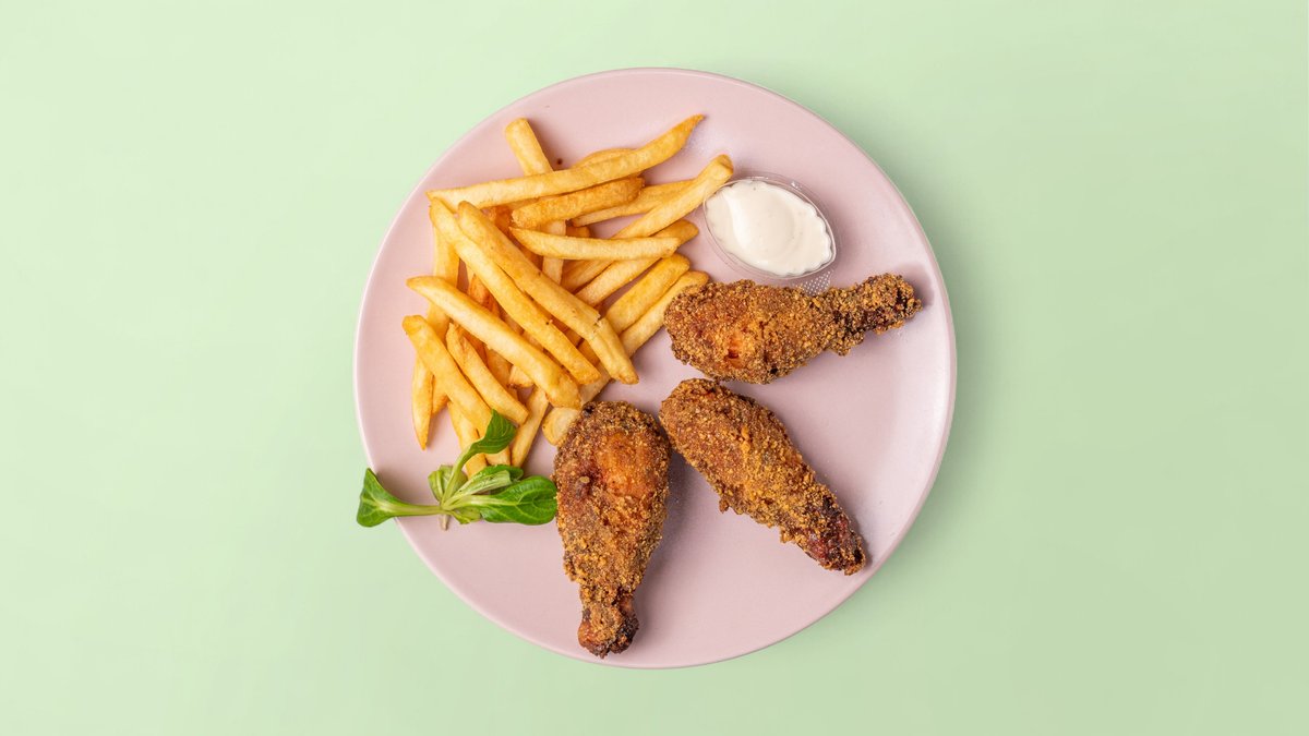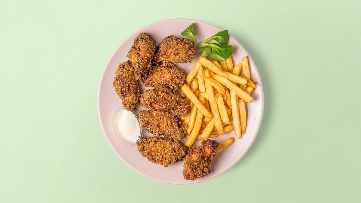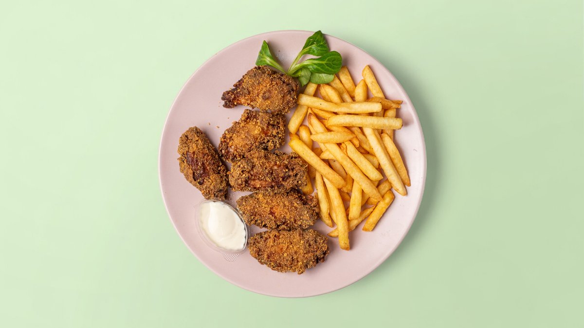 3 бр. стрипс, 3 бр. крилца, картофки, сос