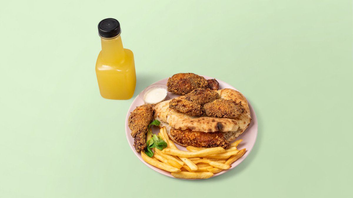 1 бр. фокача с пилешко филе, 2 бр. бутчета, 3 бр. крилца, картофки, сос, домашна лимонада