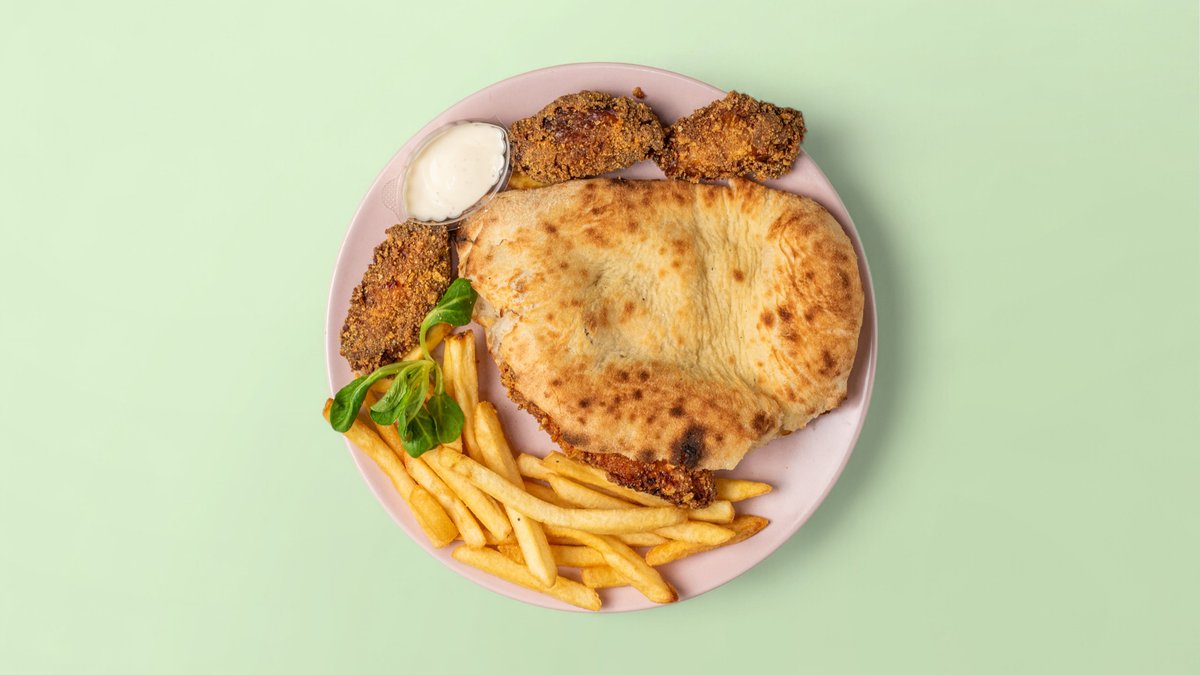 1 бр. фокача с пилешко филе, 3 бр. крилца, 1 бр. бутче, картофки, сос