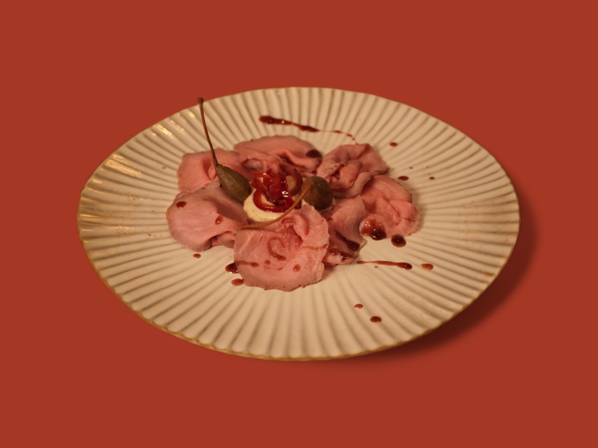 Тънко нарязано телешко филе, поднесено със сос от риба тон, каперси, майонеза, овкусен със сос Уорчестър 200г