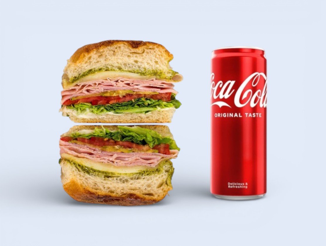 салам мортадела, сирене проволоне, тиквичка, домат, зелена салата, песто, майонеза, 400г Coca-Cola 330мл