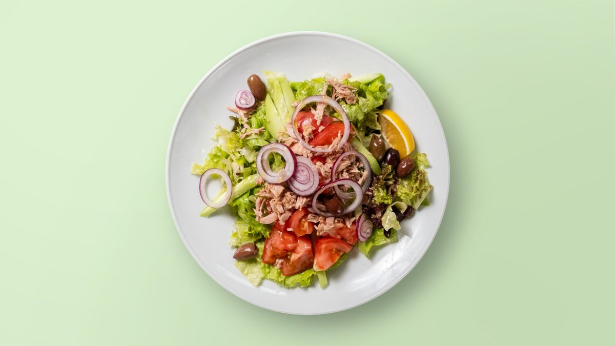 свежа салата, краставица, маслини, червен лук, риба тон, домати, лимонов дресинг 300г